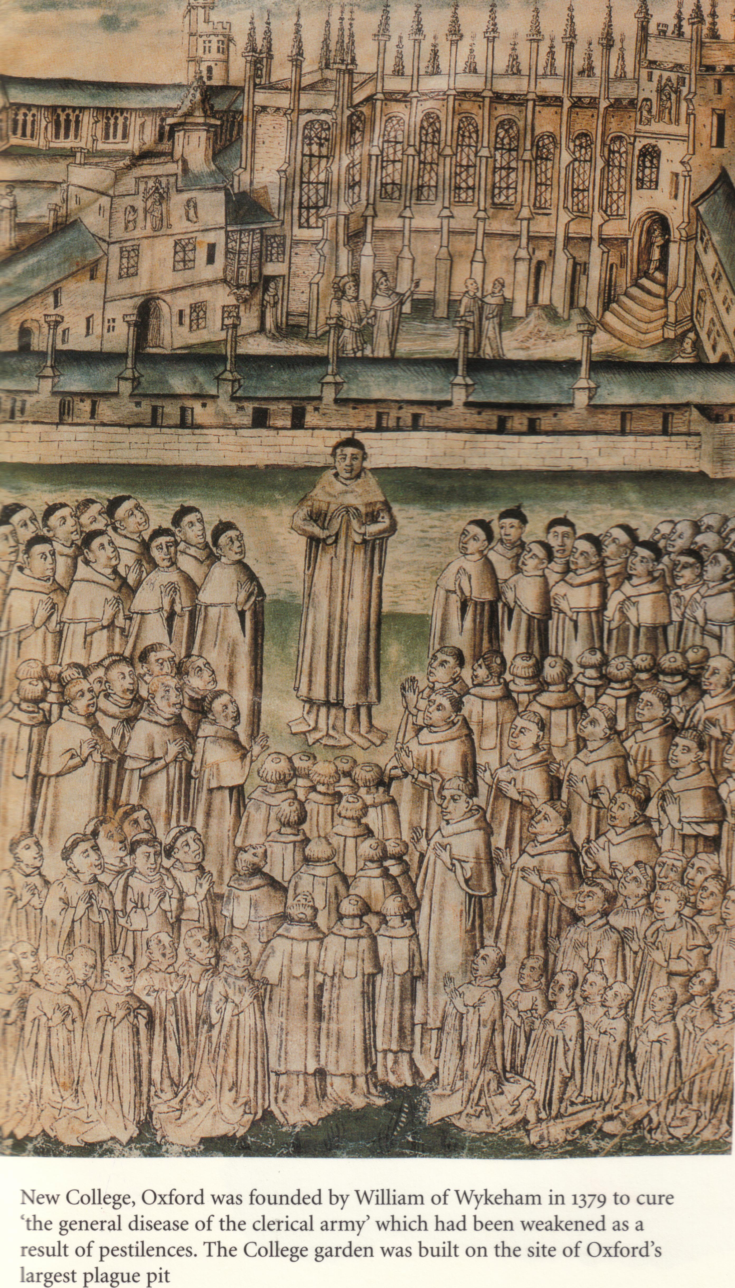 Pg 223. Similarly, a few years later, William of Wykeham, wishing to cure 'the general disease of the clerical army, which we have observed to be grievously wounded owing to the small number of the clergy, as a result of pestilences, wars and other miseries of the world'. founded New College to repair the deficiency. But New College owed more to the Black Death than the inspiration for its creation. According to tradition, backed by Thorold Rogers, New College Garden was the site of Oxford's largest plague pit, an area formally covered by houses but depopulated by the epidemic and converted to its grisly purpose
