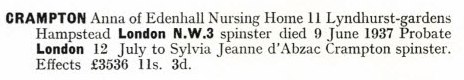 • Will Filed: (Personal Estate), 12 Jul 1937, London, England. Crampton Anna of Edenhall Nursing Home 11 Lyndhurst Gardens Hampstead london NW3 spinster died 9 June 1937 Probate London 12 July to Sylvia Jeanne d'Abzac Crampton spinster Effects £3536 11s. 3d. |